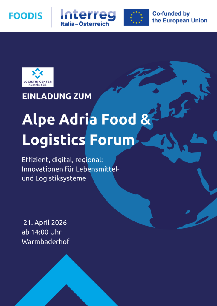 Das Alpe Adria Food Logistics Forum, am 21.04.2026, ist eine kompakte, praxisorientierte Netzwerk- und Informationsveranstaltung, die sich gezielt dem Thema Foodlogistik im Alpe-Adria-Raum widmet. Die Veranstaltung findet im Rahmen des Interreg-Projekts FOODIS statt und verfolgt das Ziel, grenzüberschreitende Kooperationen zwischen Unternehmen, Logistikakteuren und Marktinstitutionen aus Kärnten und Italien zu fördern. Im Mittelpunkt stehen logistische Lösungen entlang der Lebensmittelwertschöpfungskette, Markt- und Zugangsinformationen sowie die Vernetzung von Unternehmen aus den Bereichen Logistik, Lebensmittelwirtschaft und Außenhandel. Das Forum bietet eine Plattform, um Kompetenzen sichtbar zu machen, Marktzugänge zu diskutieren und konkrete Anknüpfungspunkte für zukünftige Zusammenarbeit zu schaffen. Dabei bildet das Interreg-Projekt FOODIS den inhaltlichen Rahmen der Veranstaltung. Es dient als Impulsgeber für Zusammenarbeit und Innovation, indem es Akteure aus unterschiedlichen Regionen vernetzt und den Austausch von Know-how im Bereich Foodlogistik ermöglicht. Es warten interessante Vortragende mit spannenden Themen rund um nachhaltige Lebensmittellogistik, innovative Kooperationen und neue digitale Lösungen auf Sie. Den Auftakt macht Andreas Pichler vom Logistik Center Austria Süd mit der Begrüßung und einem kurzen Einblick in die Bedeutung nachhaltiger und effizienter Logistik. Außerdem stellt er vor, wie Unternehmen durch Initiativen und Kooperationen im Logistiknetzwerk unterstützt werden können. Danach geht es international weiter: Ilaria Marcolin zeigt, wie grenzüberschreitende Zusammenarbeit zu nachhaltigeren Lebensmittel- und Logistiksystemen beitragen kann. Anschließend präsentiert Suzana Jakovljevic die Plattform carinthianlogistikhub.at, die als zentrale Informations- und Vernetzungsplattform für die regionale Logistik dient. Praxisnahe Einblicke gibt Roman Jaritz mit Beispielen aus der Tourenplanung in der Lebensmittellogistik – und wie durch gute Planung sowohl wirtschaftliche als auch ökologische Vorteile entstehen. Nach einer kurzen Pause dreht sich alles um die Kühlkette: Daniela Piussi erklärt, warum ein effizientes und nachhaltiges Kühlkettenmanagement für Qualität und Lebensmittelsicherheit entscheidend ist. Gerald Gregori wirft danach einen Blick auf die Lebensmittellogistik im urbanen Raum und zeigt, welche Chancen Sustainable Urban Logistics Planning und künstliche Intelligenz bieten. Zum Abschluss stellt Eric Kirschner eine Plattform zur optimierten Verteilung und zirkulären Nutzung von Lebensmittelüberschüssen vor. Und natürlich bleibt beim anschließenden Buffet auch Zeit für Austausch, neue Kontakte und spannende Gespräche. Themen Blöcke und Experten: LCA Süd Service – Andreas Pichler (Logistik Center Austria Süd) Grenzenlose Zusammenarbeit für nachhaltigere Lebensmittel- und Logistiksysteme – Ilaria Marcolin (Fondazione Agrifood & Bioeconomy FVG, Project Manager) Carinthianlogistikhub.at – Suzana Jakovljevic (Logistik Center Austria Süd) Tourenplanung in der regionalen Lebensmittellogistik – Roman Jaritz (Jaritz Transport GmbH) Effizientes und nachhaltiges Management der Kühlkette im Lebensmittelsektor – Daniela Piussi (Lebensmitteltechnologin) Lebensmittelogistik im urbanen Raum: Sustainable Urban Logistics Planning (SULP) & KI-gestützte Mehrwerte – Gerald Gregori (Unternehmensberater) Zwischenbericht: Plattform zur optimierten Verteilung und zirkulären Verwertung von Lebensmittelüberschüssen – Eric Kirschner (JOANNEUM)